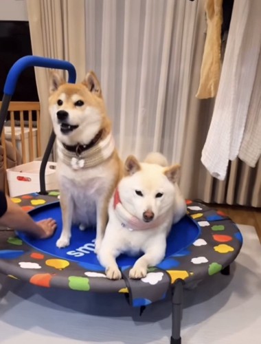 柴犬の『ポポ』ちゃんが同居犬の『ラム』ちゃんと一緒に乗っていたのは、子供用のトランポリン。