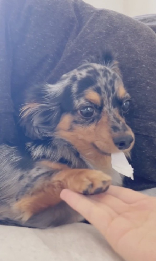 諭吉くんが披露した、スピード感あふれる渾身のお手。ティッシュは絶対返さないのに、お手には素直に反応してしまう諭吉くんに、思わず飼い主さんの「するんかい」が炸裂。