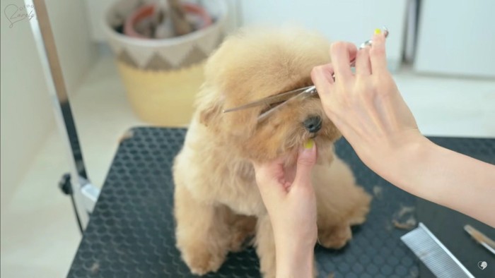 いよいよカットが始まると、ももちゃんはちょっぴり眠たくなってきたよう。カットするハサミの音も心地よく、トリミング台の上でペタンと伏せて寝てしまう一幕もあったとか。