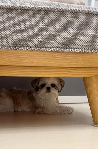 この日、ソファの下にいるタルトちゃんに「タルト、お風呂、行ってくる」と声をかけた飼い主さん。するとタルトちゃんは、ちらちらと飼い主さんの様子をうかがいながら、自らハウスへ入っていきます。